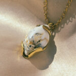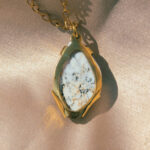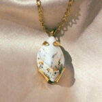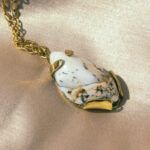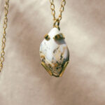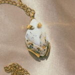 Wisiorek wykonany jest z agatu dendrytowego i mosiądzu, a łańcuszek ze stali chirurgicznej.
